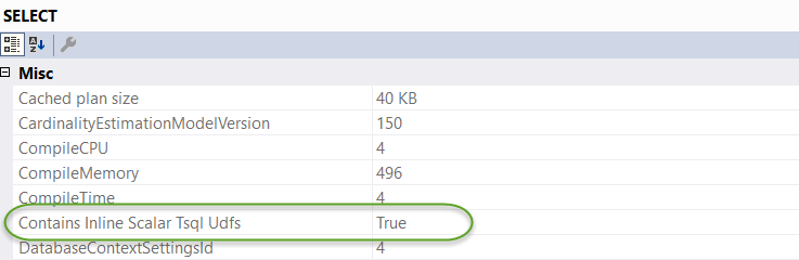 If your function is not inlined you will NOT see the attribute ‘Contains Inline Scalar Tsql Udfs’ in the root node. Instead, you will see two different attributes under ‘QueryTimeStats’ named ‘UdfCpuTime’ and ‘UdfElapsedTime’. I explained this in detail here.